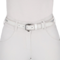 The belt features both a fixed and a loose loop and is finished with a silver-colored buckle.