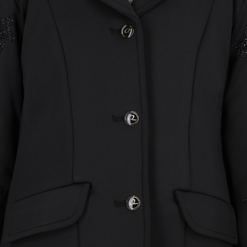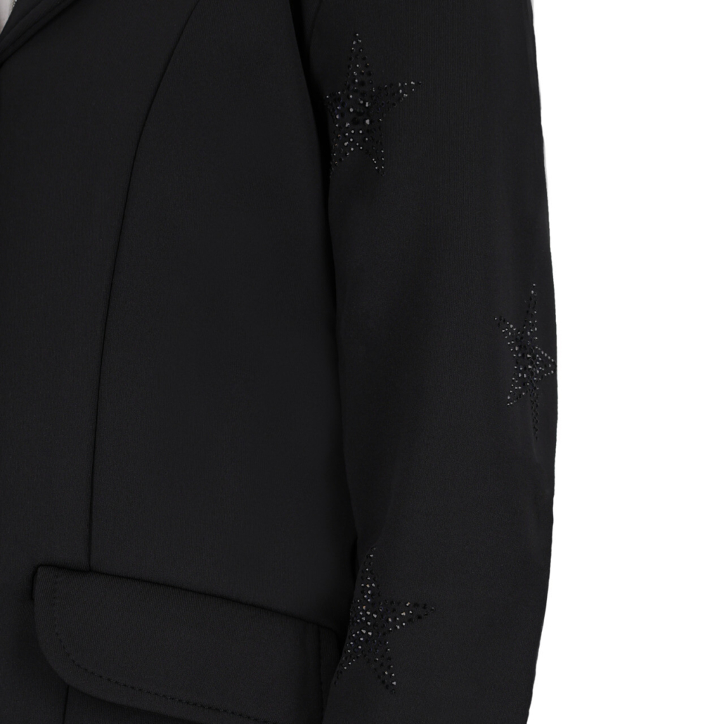 Shine at your competition with this elegant show jacket. The jacket features glitter stars and luxurious Q-buttons. The stretchy, breathable fabric ensures a comfortable ride.