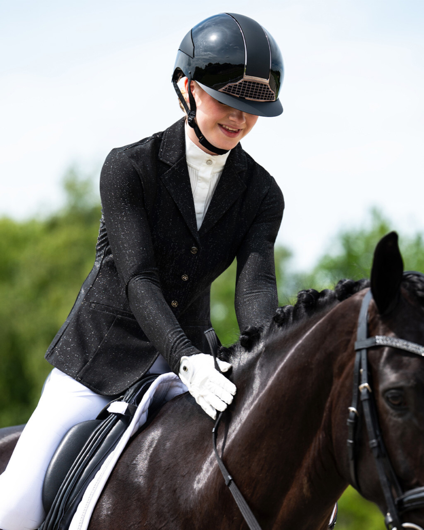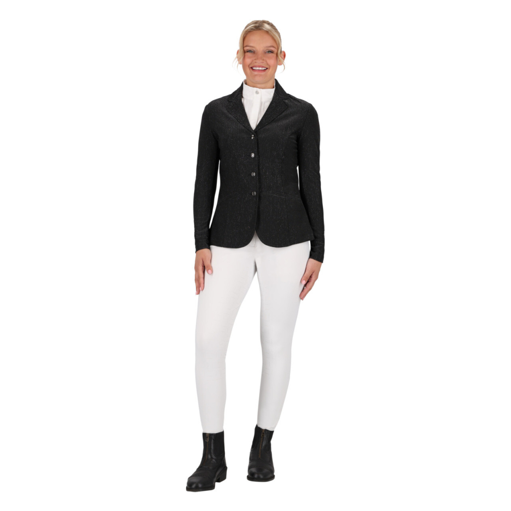 The Kynlee competition jacket is fully finished with a sparkling glitter layer, creating a bold yet stylish look. The pleats at the back and the luxurious Q-buttons add an elegant touch.