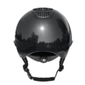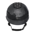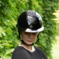 Ridehjelm i et smukt og iøjnefaldende high gloss look med bred skygge, samt mønster i pyntesten henover midten, placeret på et suede look panel.
