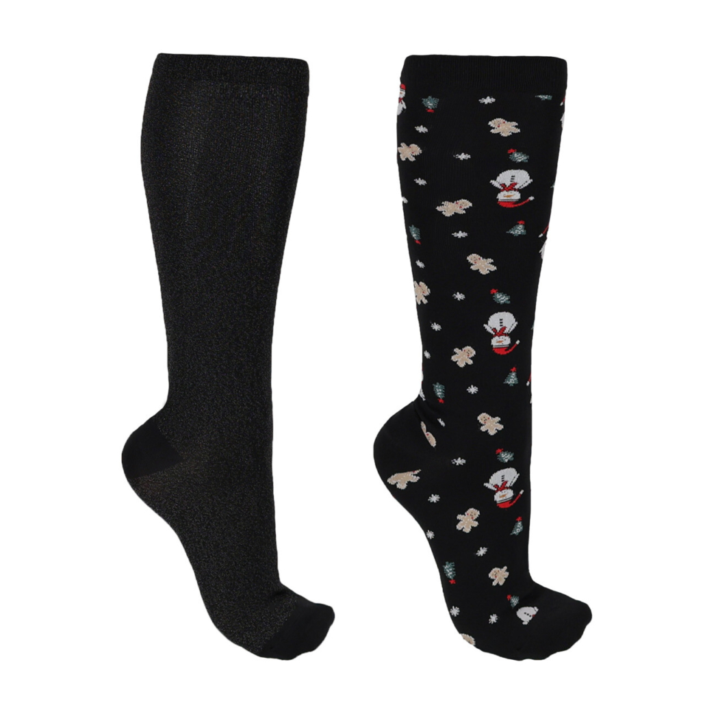Bring the holiday spirit to your riding outfit with this set of two pairs of socks featuring a festive Christmas pattern and glitter! Specifically designed for equestrians, these socks are made from elastic fabric for optimal comfort, both in and out of your riding boots. Pair them with our other matching Christmas products for a stylish holiday look!