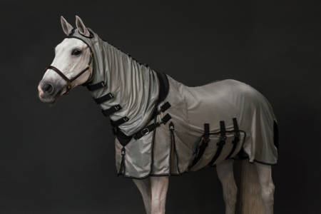 The fly sheet is fitted with chest and shoulder gussets, belly flap and elastic leg cords. Made with a long neck that continues on to the head with openings for the ears. The front fasteners are located on the side of the sheet so they do not irritate the middle of the chest and neck area. The elastic in the front and on the withers ensures an optimal fit. The elastic on the front also ensures that no pressure can come on the horse’s windpipe. The special girth fasteners in PresTeq shape provide extra convenience with a turn and click fastener. In addition, the fly sheet is lined with nylon at the mane, forelock, shoulders and tail flap to prevent chafing. The tail flap is extra wide for optimal protection and features an anatomical ShapedTEQ. This means that the tail flap has been cut back further for extra freedom of movement of the tail.