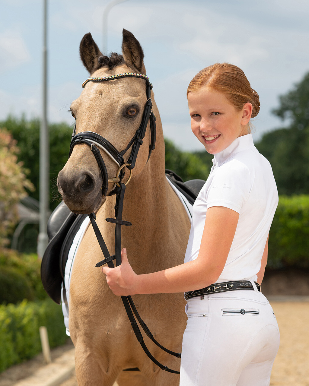Belt Ricki is decorated with two small bits and rhinestones on the leather attachment of the bits. The leather belt is finished with white stitching and features a stainless steel buckle.