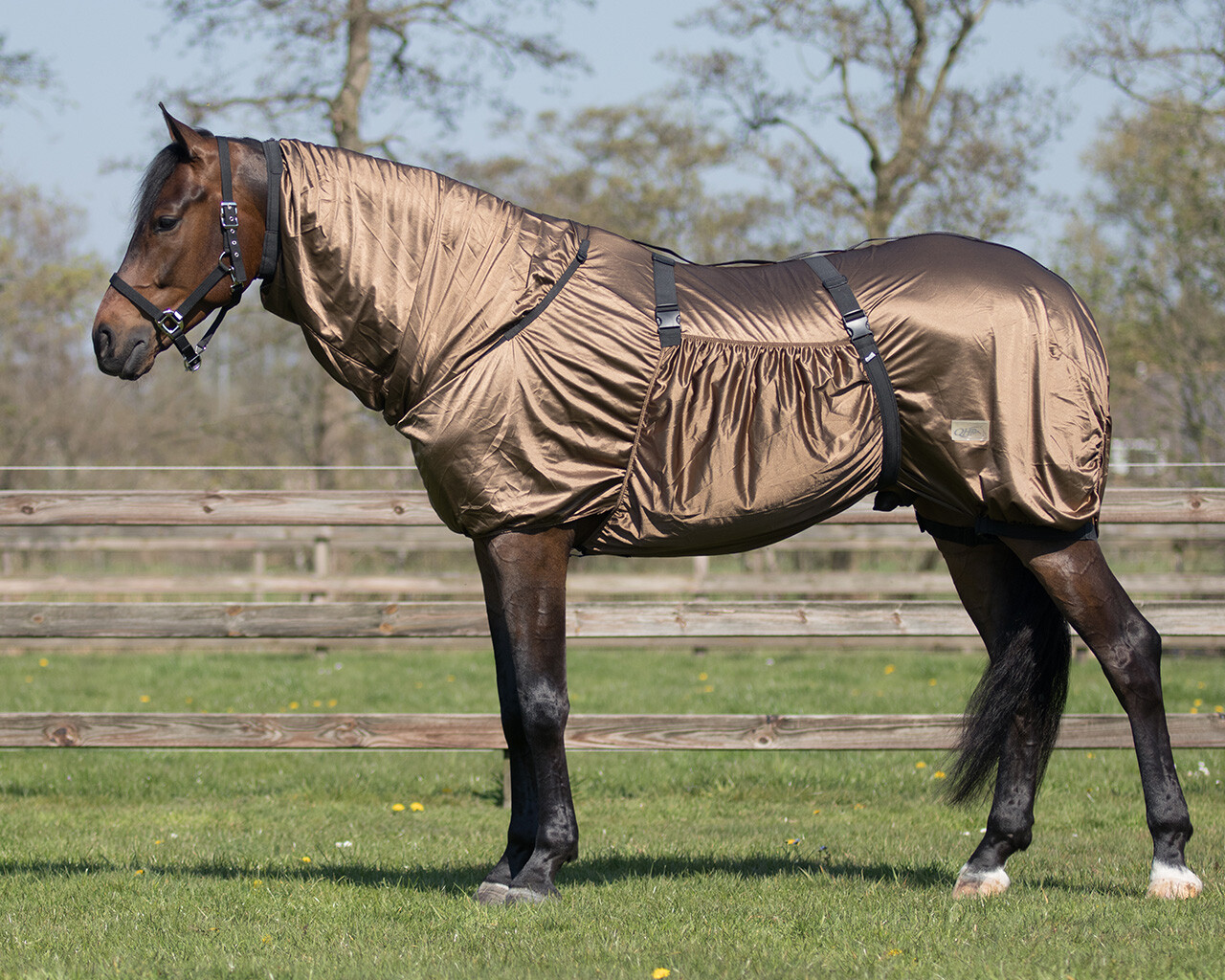This eczema rug features an attached neck with elastic closure, a wide belly flap with elastic, adjustable surcingles and a wide tail flap. The rug has plastic closures and has a closure between the front legs to attach the belly flap. Research has proven that a zebra pattern deters flies due to the fact that the stripes reflect light. This reflection irritates insects.