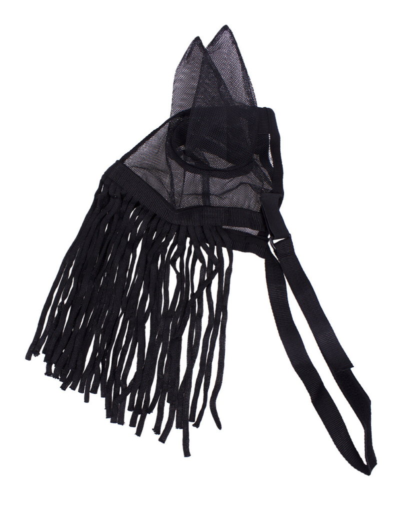 Anti-fly fringe which features fine mesh ears and an elastic throat latch. The fringe can be used without head collar due to the throat latch.