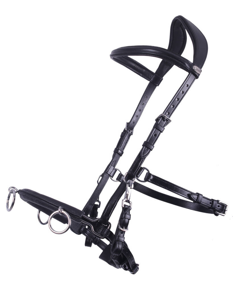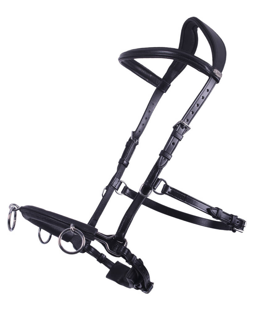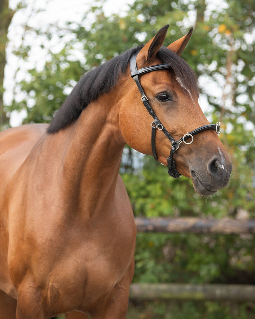 Multifunctional leather cavesson that can also be used as a bridle. Due to the removable bit clips, the cavesson can be used with or without bit. Three rings are attached to the nose strap to which a lunging line can be attached. Equipped with an anatomically shaped crown piece.