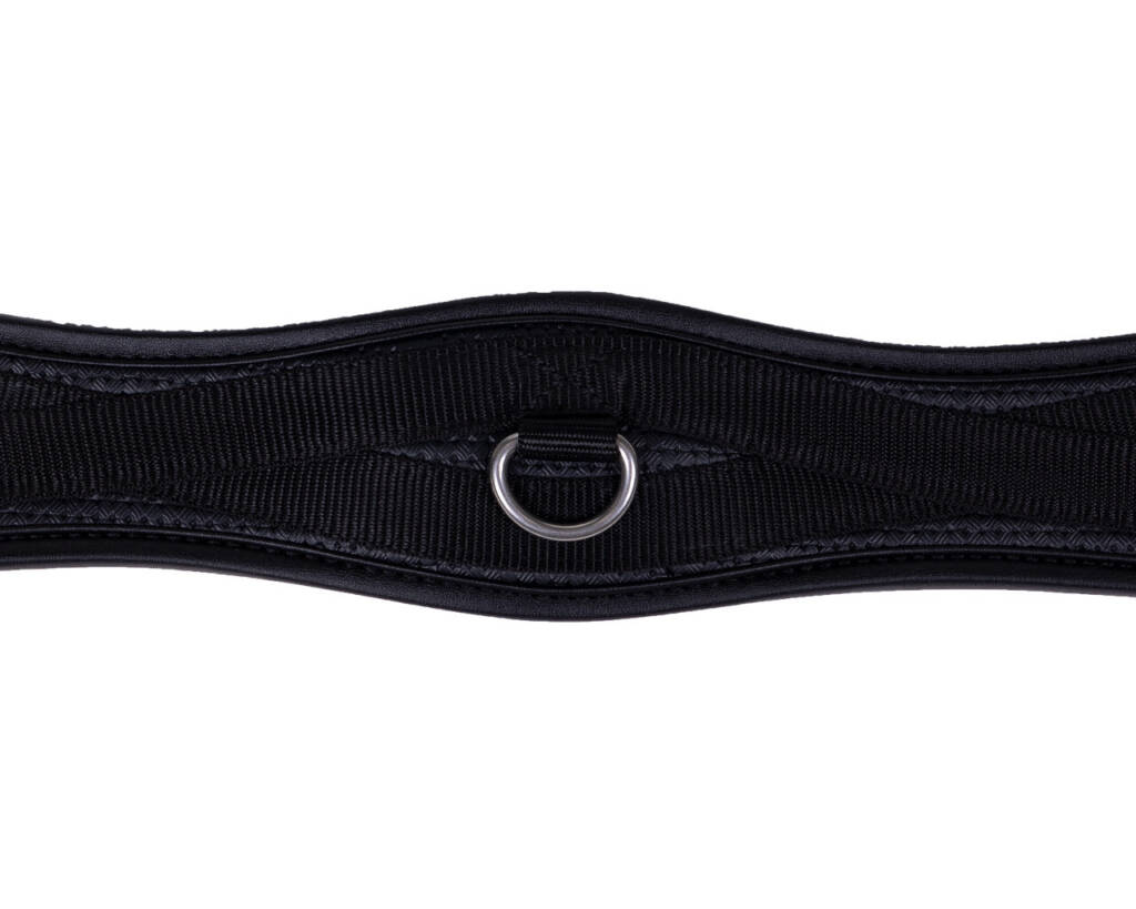 Fine black all purpose girth made of strong material. Because the girth is anatomically shaped it provides more comfort and freedom of movement. The girth has a ring in the middle for attaching an training aid.