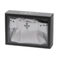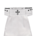 This satin stock tie features small rhinestones in black and silver, with an embroidered ‘Q’ at the bottom. It is easy to attach with the hook-and-loop fastener.
