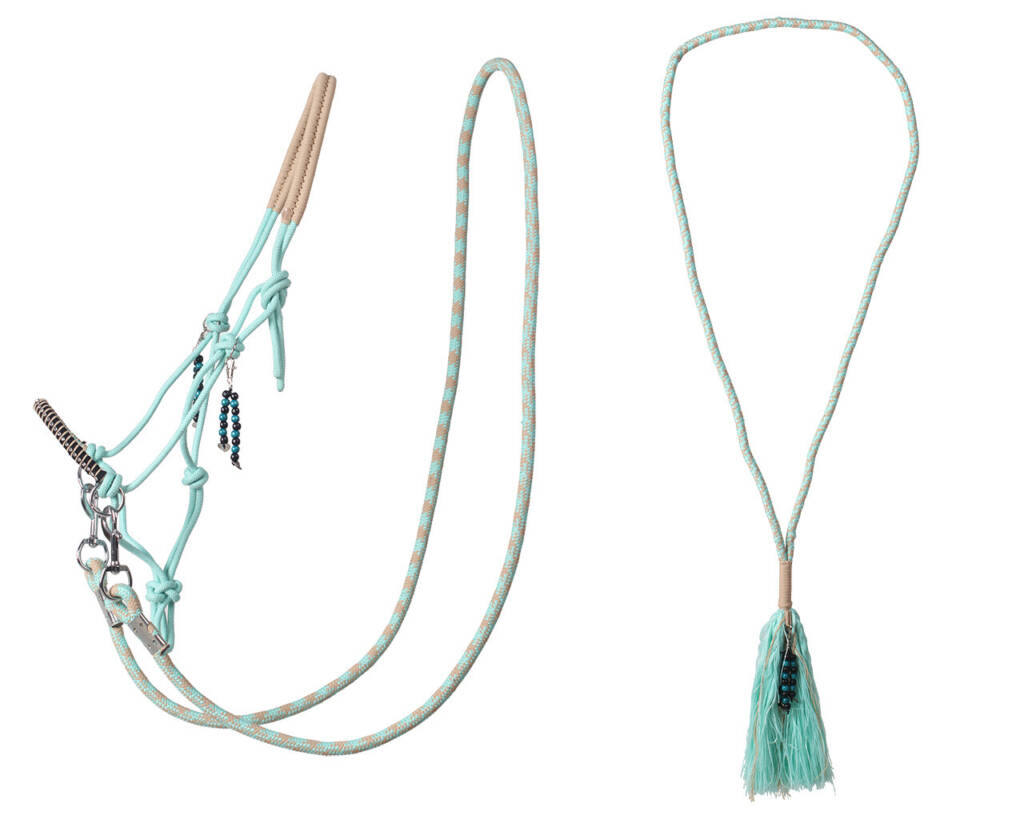Set of rope halter with detachable reins and neck rope. Both the rope halter and the bottom of the neck rope have detachable charms. The items are suited for natural horsemanship or riding bitless.
