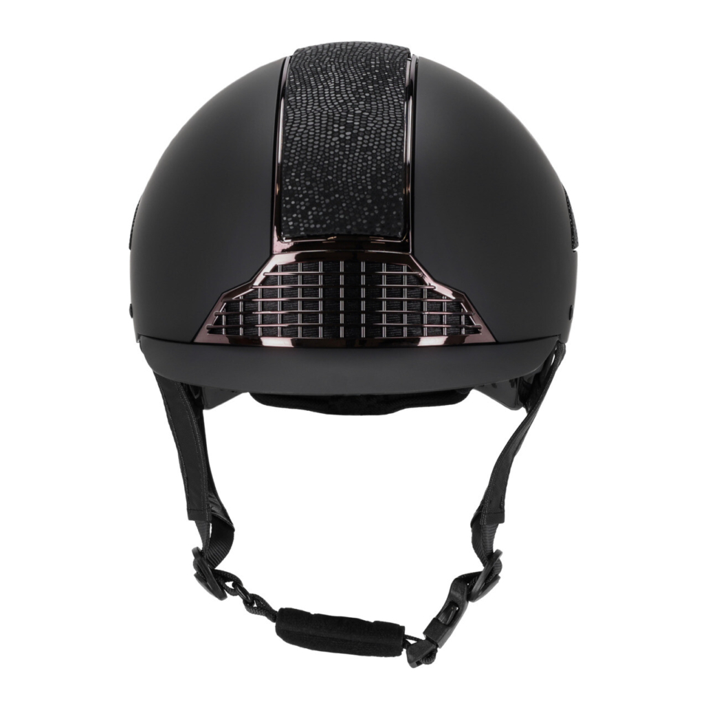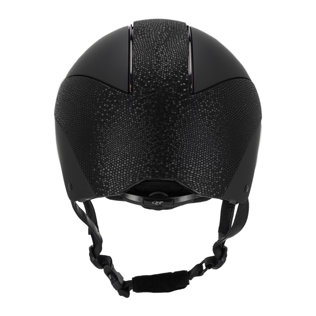 - The chin strap of the black helmet is covered with black synthetic leather