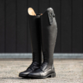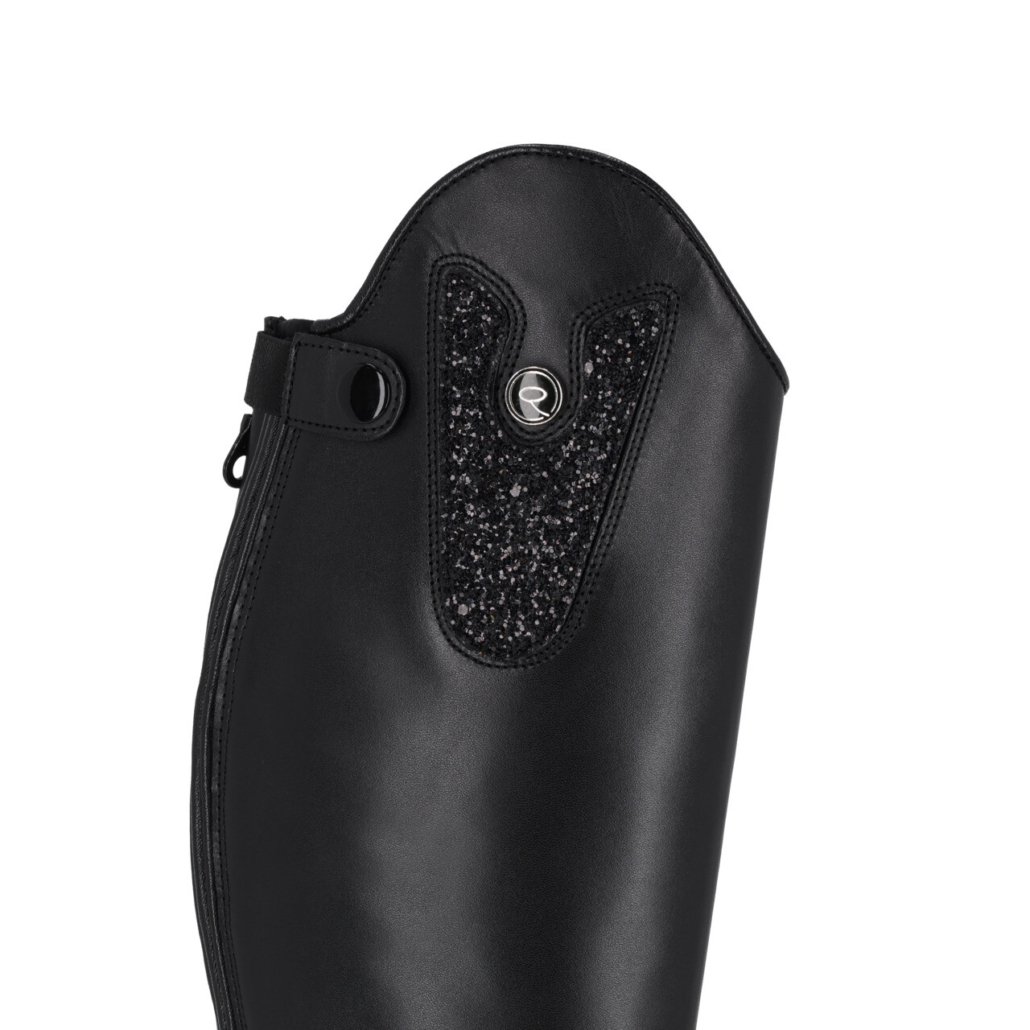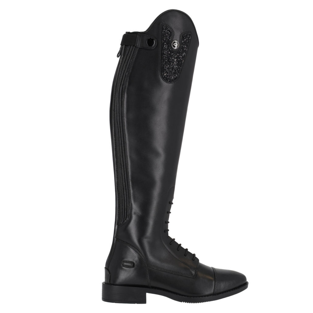 Adjust this riding boot to your style! The top features a Hook-and-loop fastener so decorative designs can be attached to the riding boot. The boot comes with a glitter design. Other designs are available separately. The riding boot features a zipper with elastic insert in the back and an elastic lace in the front.