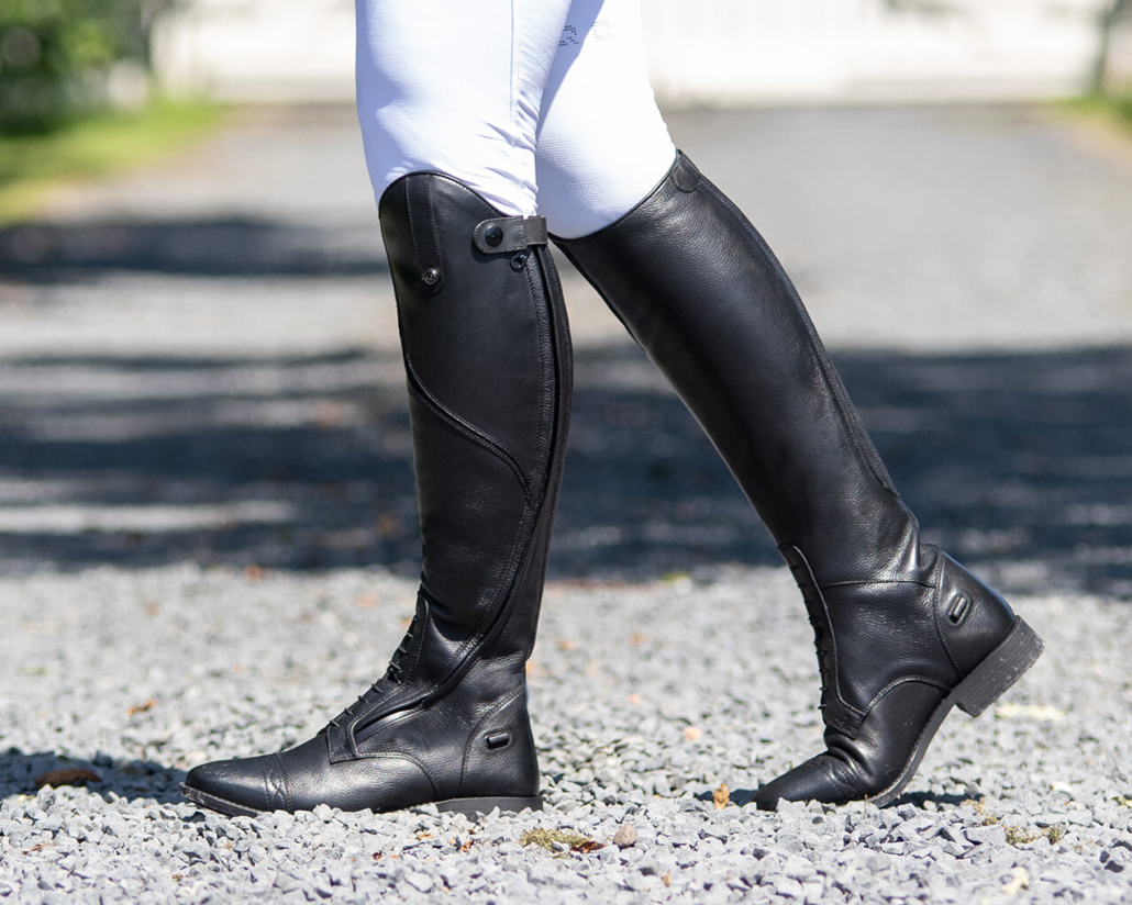 Elegant riding boot from flexible and high quality leather. The decorative line on the boot provides an elegant look. The slanted location of the zipper provides comfort and durability. Thanks to the flexible leather, elastic lacing and its elastic insert on the backside it’s a very comfortable boot to wear.