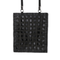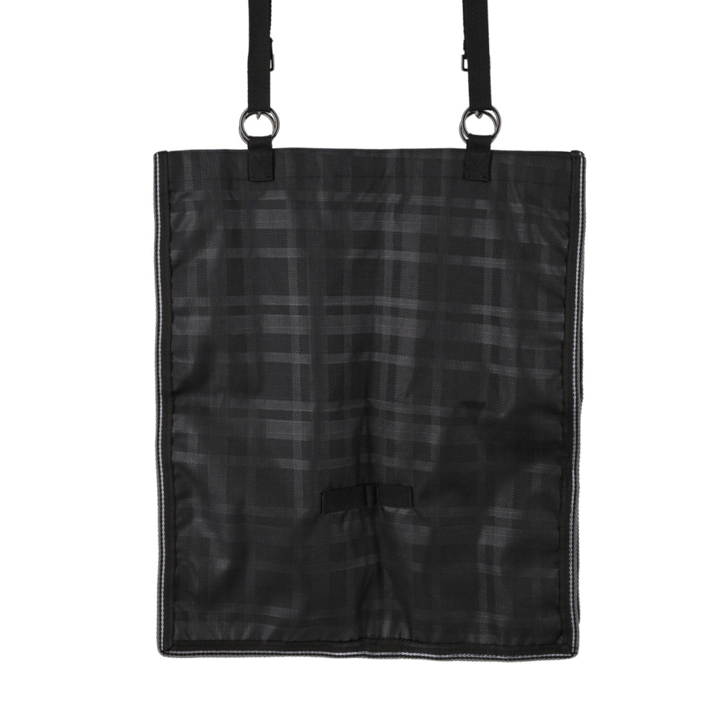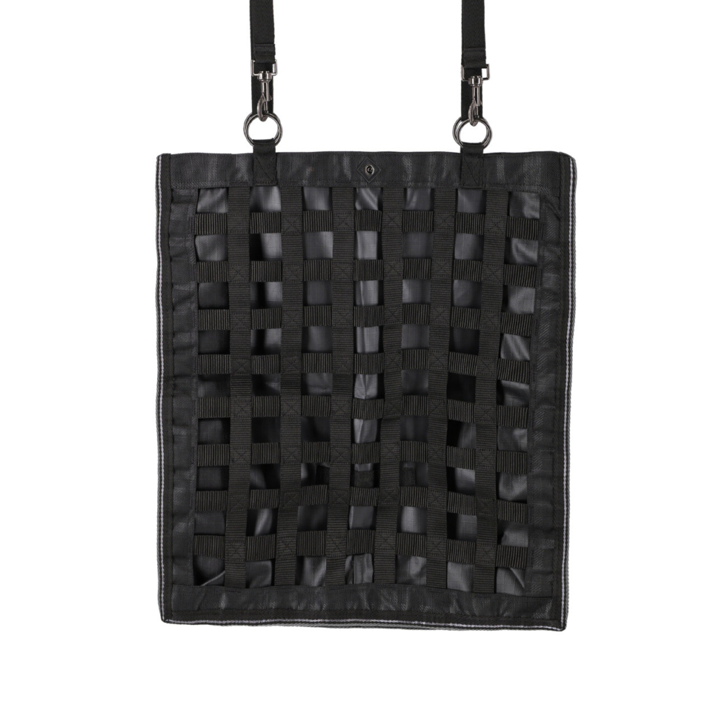 Hay bag with a net of wide fabric strips. At the top, there are four rings with adjustable loops and clips to hang the bag. The hay bag can be closed at the top with a hook and loop fastener. Due to the strong 600D fabric, the horse will not damage the bag.