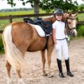 Sporty competition shirt which is made of a supple and smooth fabric. The shirt has a hidden zipper, with a glittery press stud at the top. The collar has a glitter border.