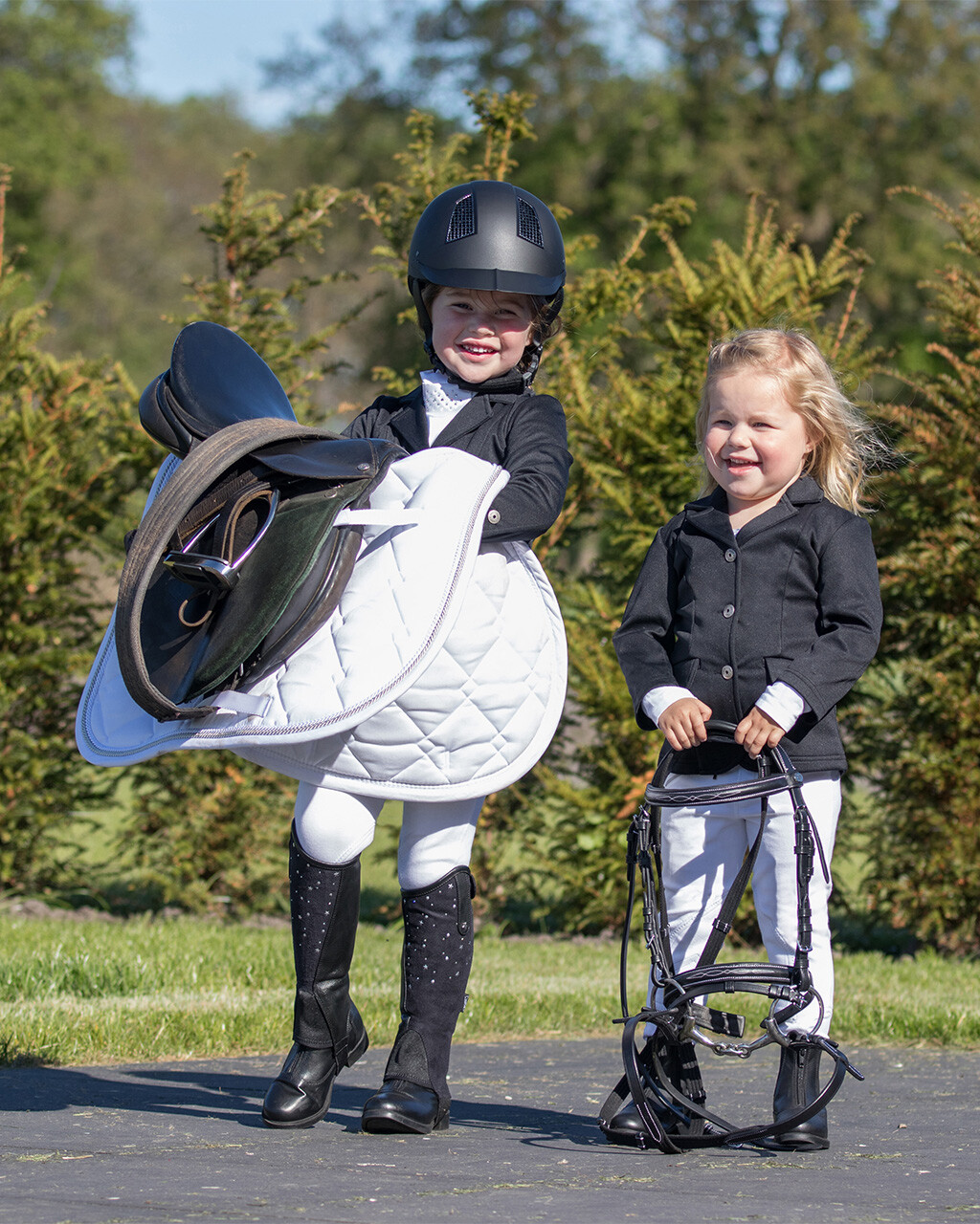 Basic competition jacket Robin Junior is made of a light stretching fabric. The jacket features a button closure with “Quality Horse Products” buttons. The same buttons are placed on both sleeves. The back features a double vent. The jacket is finished with a metal QHP badge under the left pocket in the front.