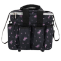 This grooming bag from the Lize collection has multiple pockets and closes at the top with a zipper. Inside, you’ll find a zippered pocket, a clear pocket for a card, and two loops for pens. There are various pockets around the bag for items like a water bottle or spray for your pony. Additionally, there is a zippered pocket on the front. The bag features a shoulder strap and handles for easy carrying.