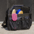The grooming bag mesh has a sturdy center piece with a handle. This makes the grooming bag easy to carry. The mesh bottom ensures that the bag is easy to keep clean. The mesh pockets and the zippered pocket at the back give you plenty of storage space.