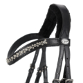 This anatomically shaped bridle features removable and washable faux fur lining under the noseband, headpiece and buckle. The specially shaped noseband and slightly recessed headpiece leave sensitive areas of the head free. Features a wave-shaped browband, double adjustable throat strap and soft padding under the browband and flash noseband.