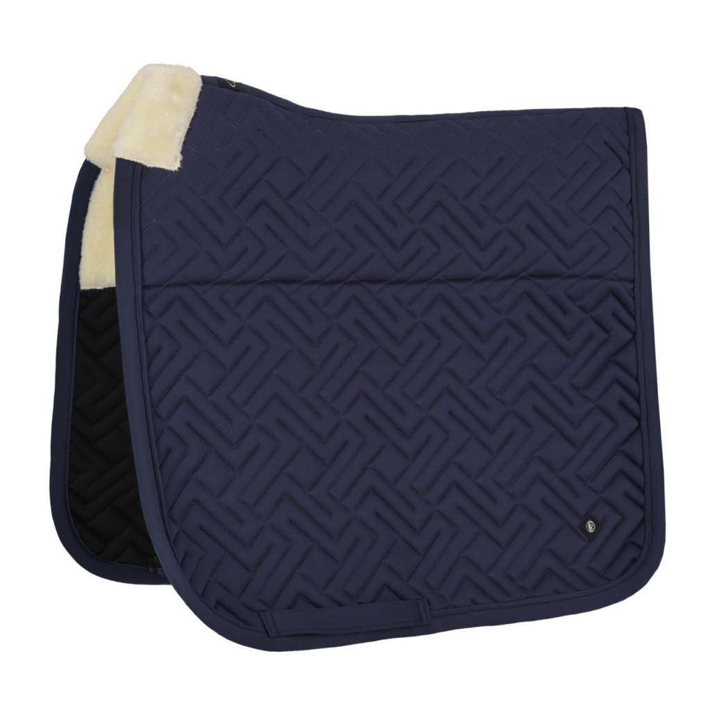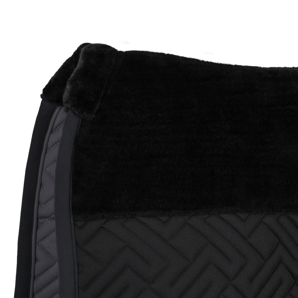 The SensiSoft saddle pad is specially designed for the sensitive horse skin. It has an anatomical back for extra comfort, luxurious decorative stitching and contrasting piping. The absorbent mesh lining absorbs sweat well, while the faux fur is soft to touch. Features a Q-pin on the left side and girth loops.