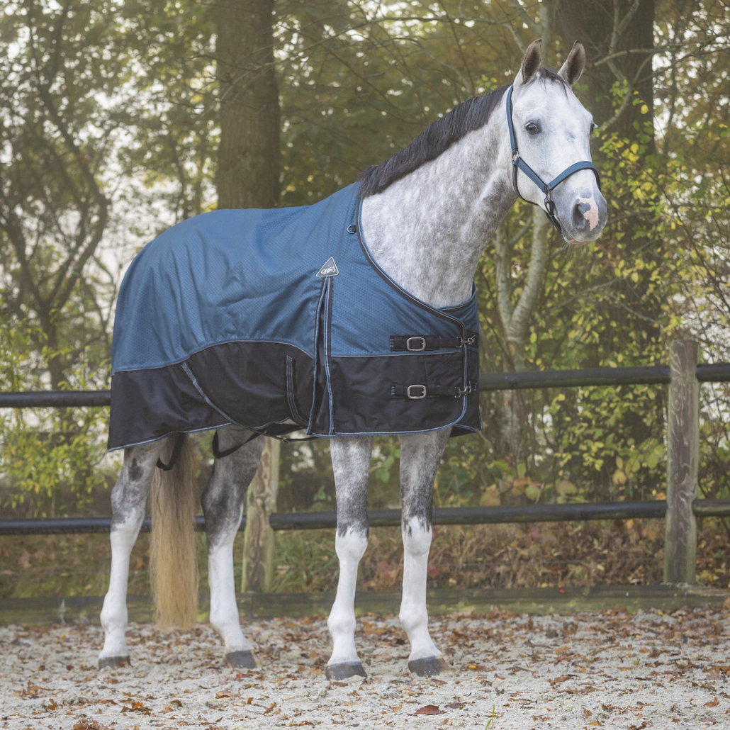 Strong, waterproof and breathable rain rug with 50 grams of filling, designed to keep a horse warm in wind, rain and lower temperatures. The rug features a special fit at the chest, preventing any gaps for horses with a broader chest. A detachable neck can be attached to the D-rings at the neck.