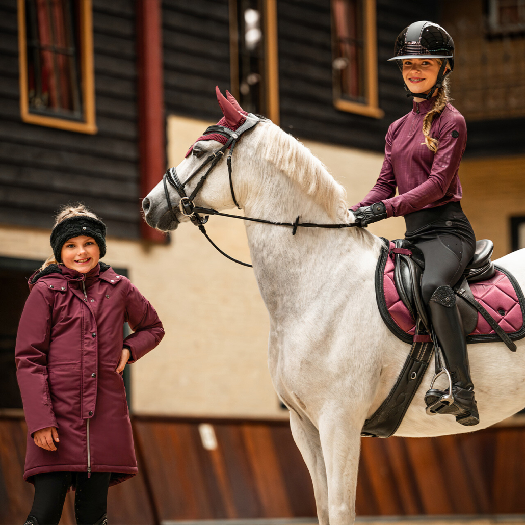 The Maelynn winter jacket from the winter collection features a hood that can be secured to prevent it from blowing up while riding. The jacket has a warm lining on the inside and elastic cuff closures for extra comfort, making it perfect for cold days. Additionally, the jacket is equipped with a practical two-way zipper and handy side pockets.