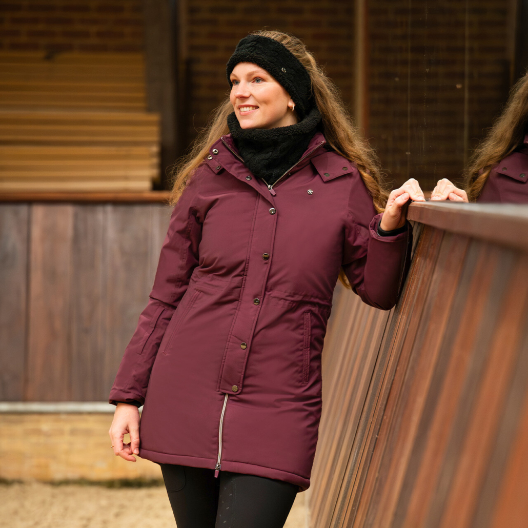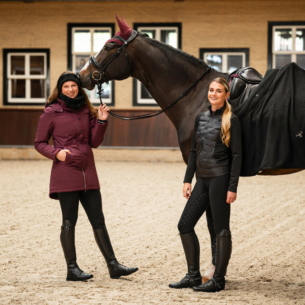 The Maelynn winter jacket from the winter collection features a hood that can be secured to prevent it from blowing up while riding. The jacket has a warm lining on the inside and elastic cuff closures for extra comfort, making it perfect for cold days. Additionally, the jacket is equipped with a practical two-way zipper and handy side pockets.