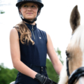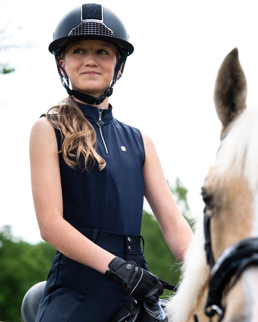 This tank top has a sporty look and is made from a smooth, stretchy fabric. Finished with glitter fabric on one side, a silver 1/4 zipper and a luxurious Q-pin on the chest. Pair it with the other Aubree items for a complete look!