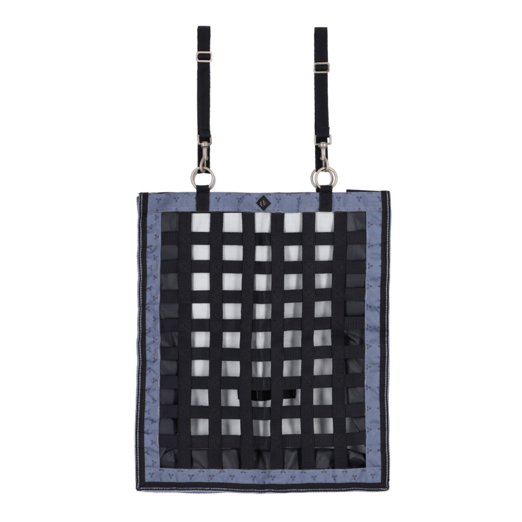 Hay bag with a net front made of wide strips of fabric. Features four rings on the top with adjustable loops to attach the bag. The hay bag can be closed at the top with a hook-and-loop fastener. Because the bag is made of strong 600D fabric, the horse won’t easily damage it.