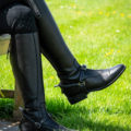 Black patent leather spur straps with a silver-coloured stainless steel buckle. Finished with a suedine slider adorned with large and small rhinestones for a chic look.