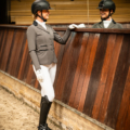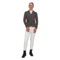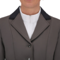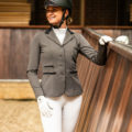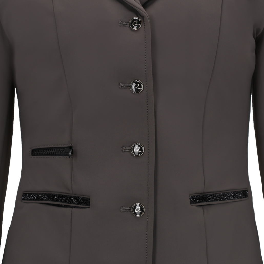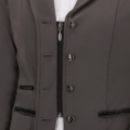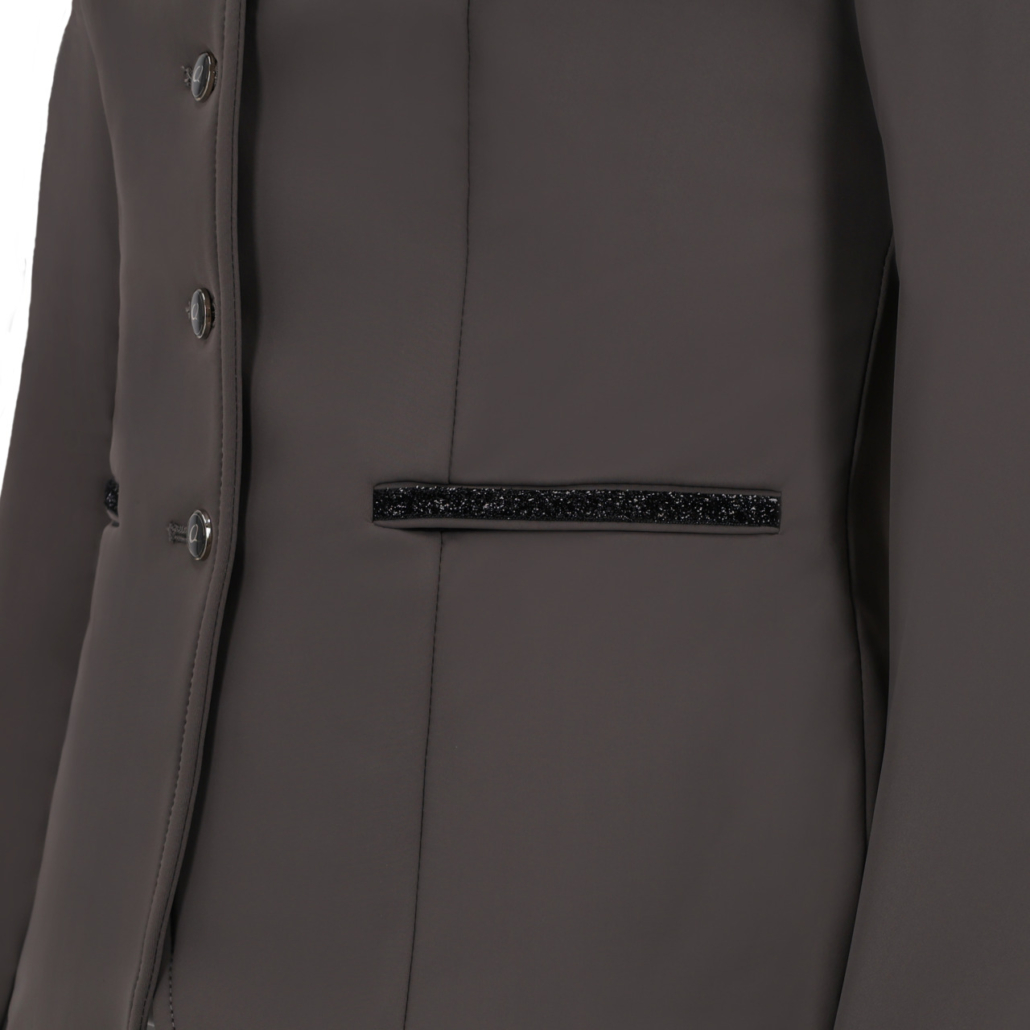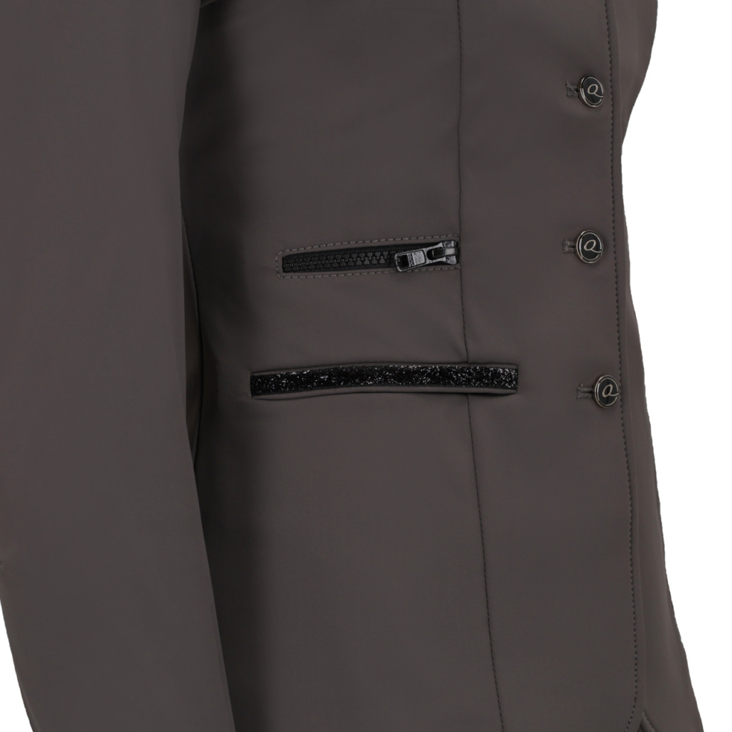 Shine during your competition with this chic competition jacket. The jacket has a concealed zipper behind the button closure so that the buttons won’t pull. The stretchy, breathable fabric ensures a comfortable ride and is also water-repellent. The glitter tape on the zip pockets and black faux zip pocket complete the jacket.