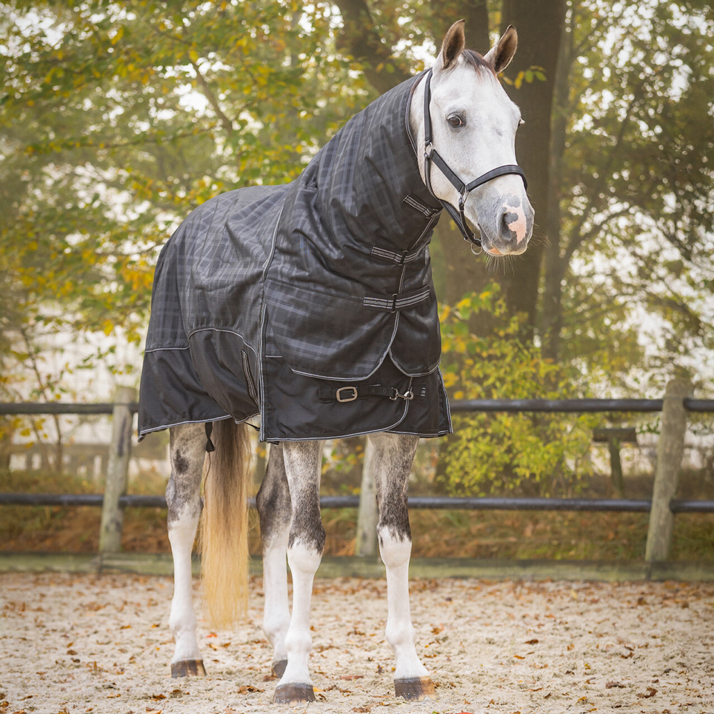 Strong winter rug with 150 gram filling. The rug has a custom fit at the chest which prevents an opening on horses with a wider chest. The rug is also waterproof and breathable. The neck can be easily attached with clips to three D-rings on the rug.