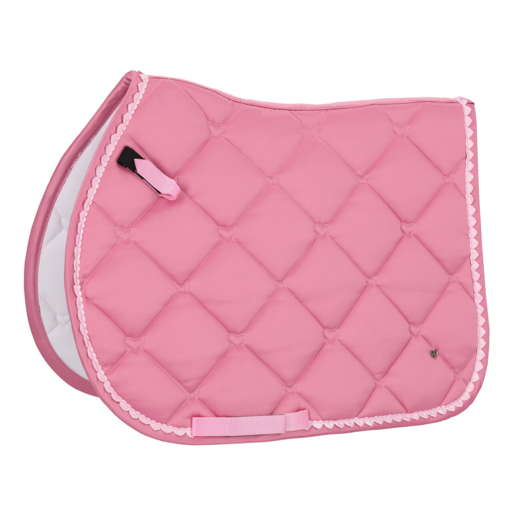 This anatomically shaped saddle pad features a breathable mesh lining that effectively wicks away sweat. It has short D-ring loops and girth loops with a hook-and-loop closure for a secure fit. Finished with a subtle heart-shaped cord and a heart-shaped Q-pin.