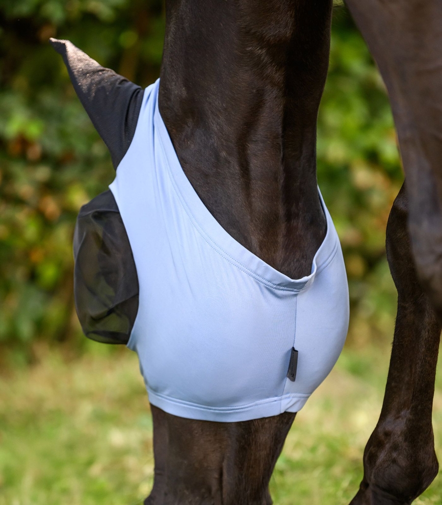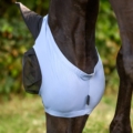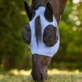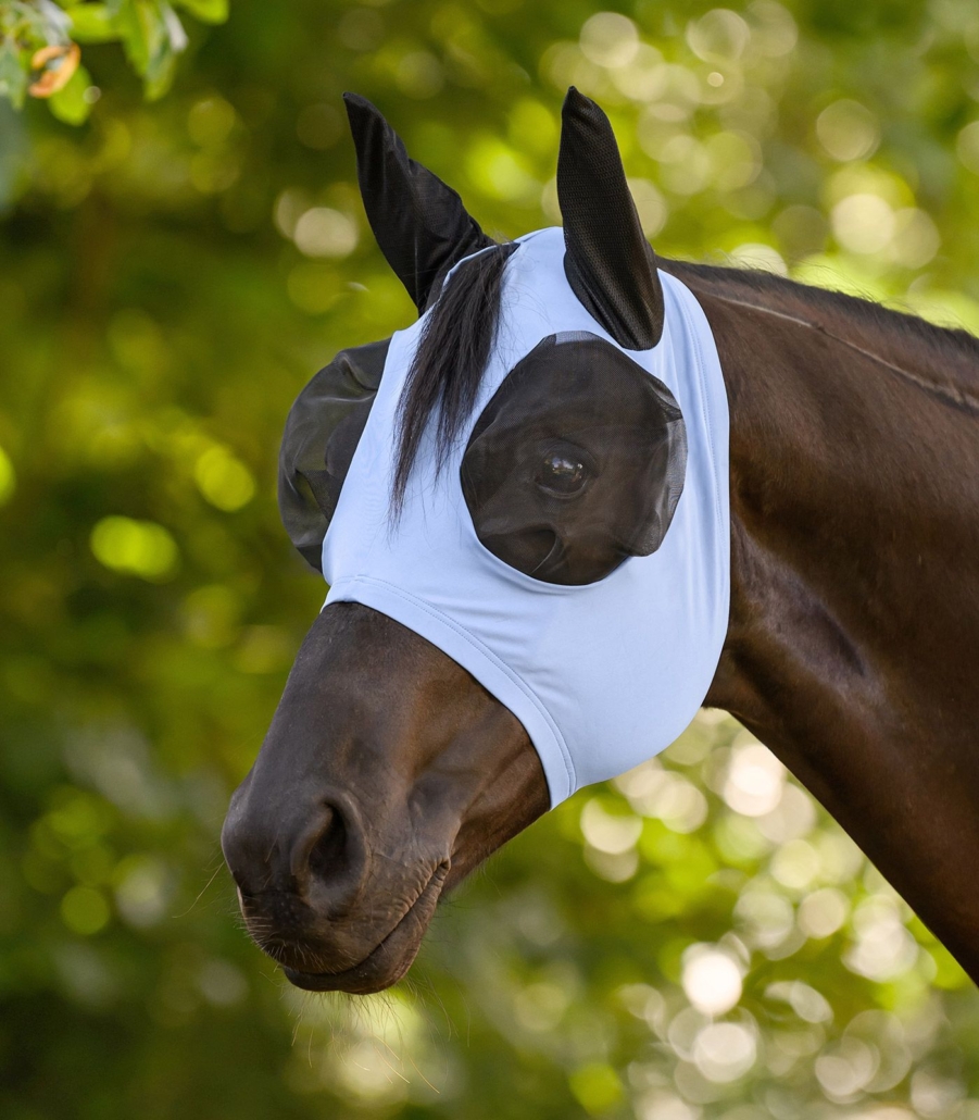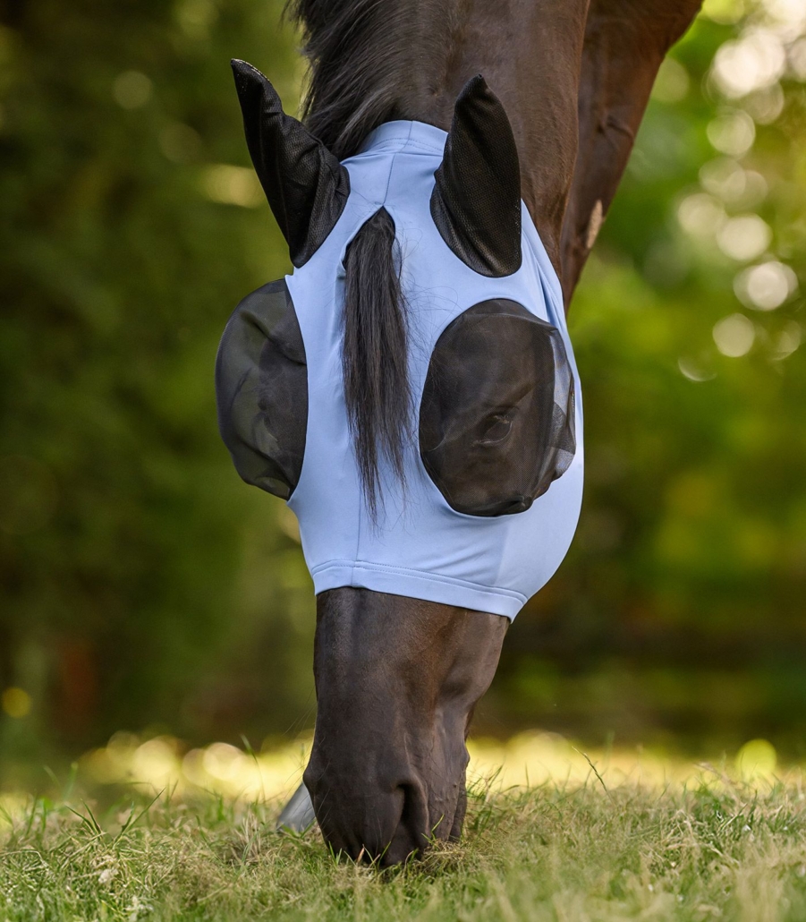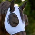 Pålidelig beskyttelse mod irriterende fluer. Flex-fluemasken er nem at tage på takket være det elastiske materiale og tilpasser sig godt til hestens hoved – uden behov for lynlås. Det tætsiddende design forhindrer insekter i at komme ind, mens den store øjenplads sikrer enestående komfort.